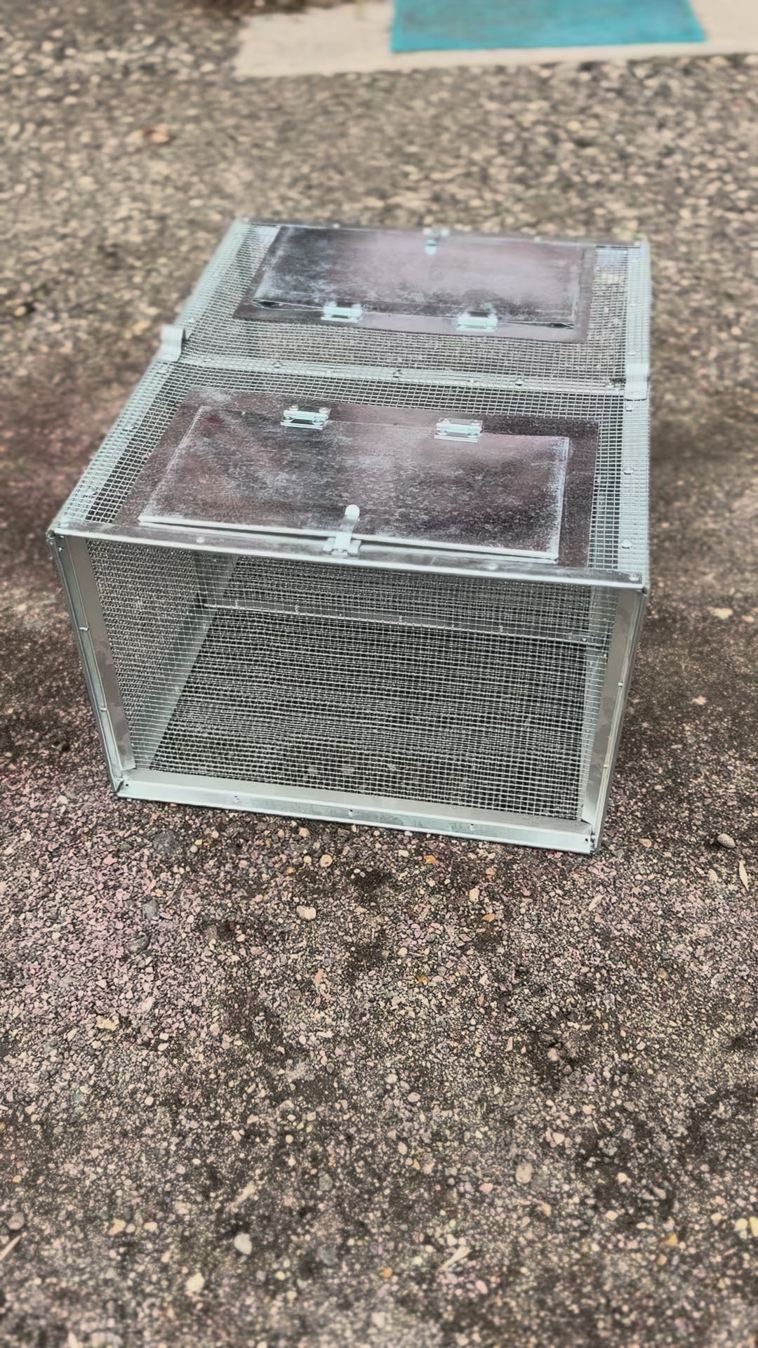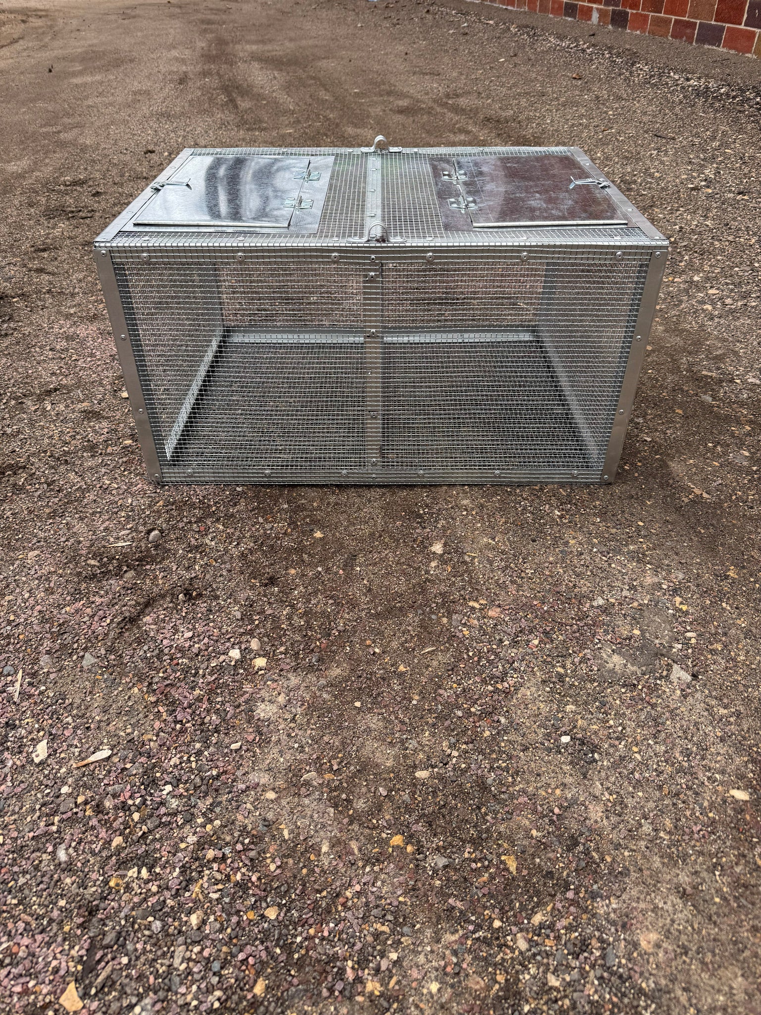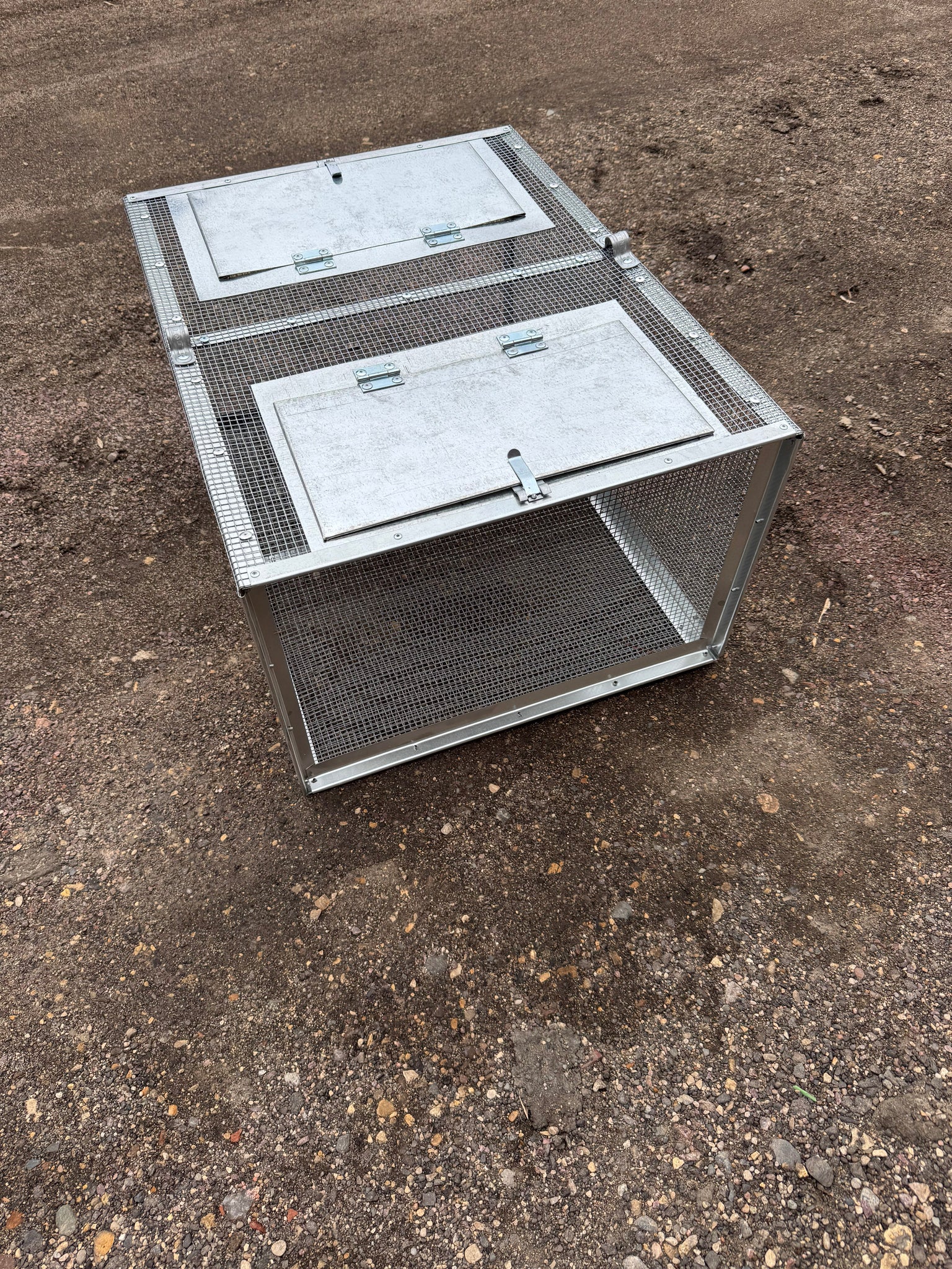 The storage box has a hinged door on the top for access to the compartment. It can be used for minnows or other fish. It is made with 1/4 inch galvanized wire.